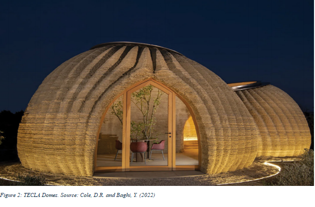Using locally sourced materials: natural raw earth, rice husks, and water; TECLA’s construction eliminated the need for extracting and transporting materials, a process responsible for almost half of a building’s complete energy contribution. Printed in just over one week, the first full scale prototype used the Crane WASP 3D printer, which has dual synchronised robotic arms. These metal arms exceeded limitations with typical human operated machinery, with 150km of ground being extruded with ease.TECLA housing featured two interconnected dome-shaped components with 350 stacked layers of clay arranged in a rippling pattern (Figure 2).