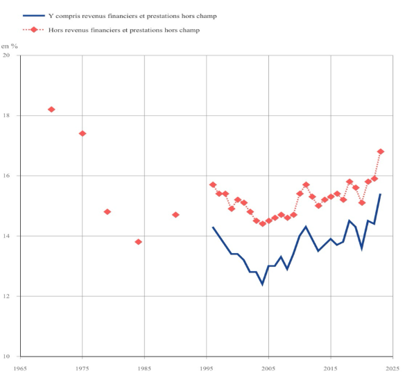 Selon l’INSEE, en France, le taux de pauvreté a diminué depuis les années 1970. Cependant il atteint aujourd’hui un point haut depuis le milieu des années 1990. En effet, en 2023, le taux de pauvreté est de 16,8 %, son niveau le plus élevé depuis le début de la série en 1996 (où il n’était qu’à 15,7%). On note une augmentation de 1,1 point de pourcentage entre 1996 et 2023, qui peut s’expliquer en partie grâce à la crise sanitaire de 2020. Ce taux de pauvreté croissant illustre la persistance de cette condition.